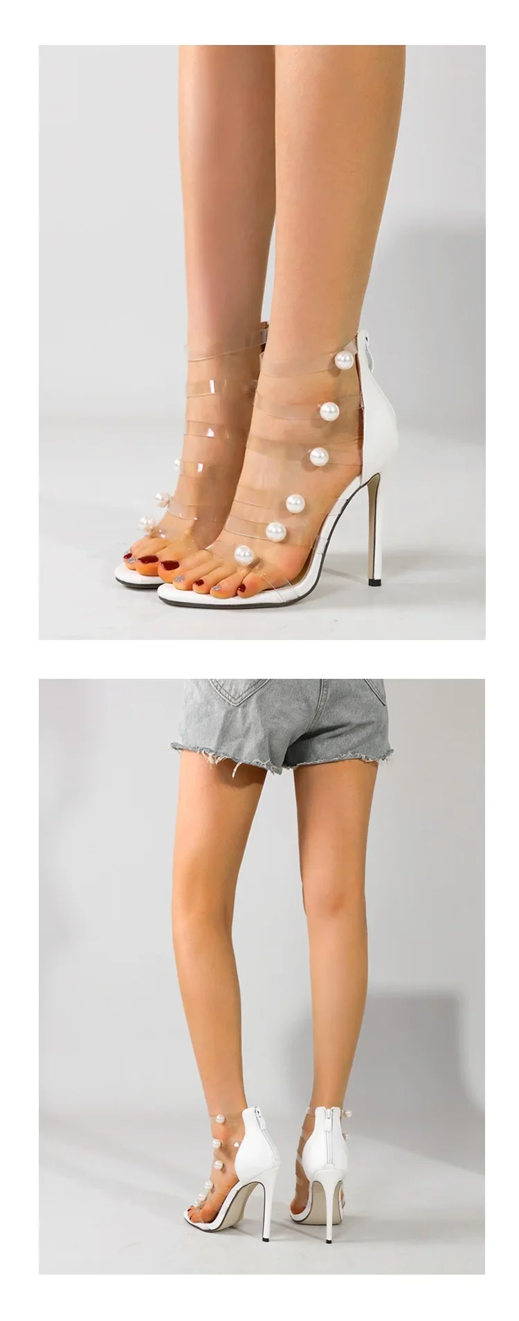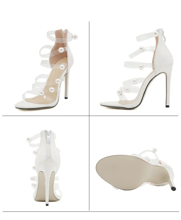 Eilyken Street Style PVC Transparent Pearl Narrow Band Zipper Women Sandals Sexy Thin High Heels Stripper Prom Shoes