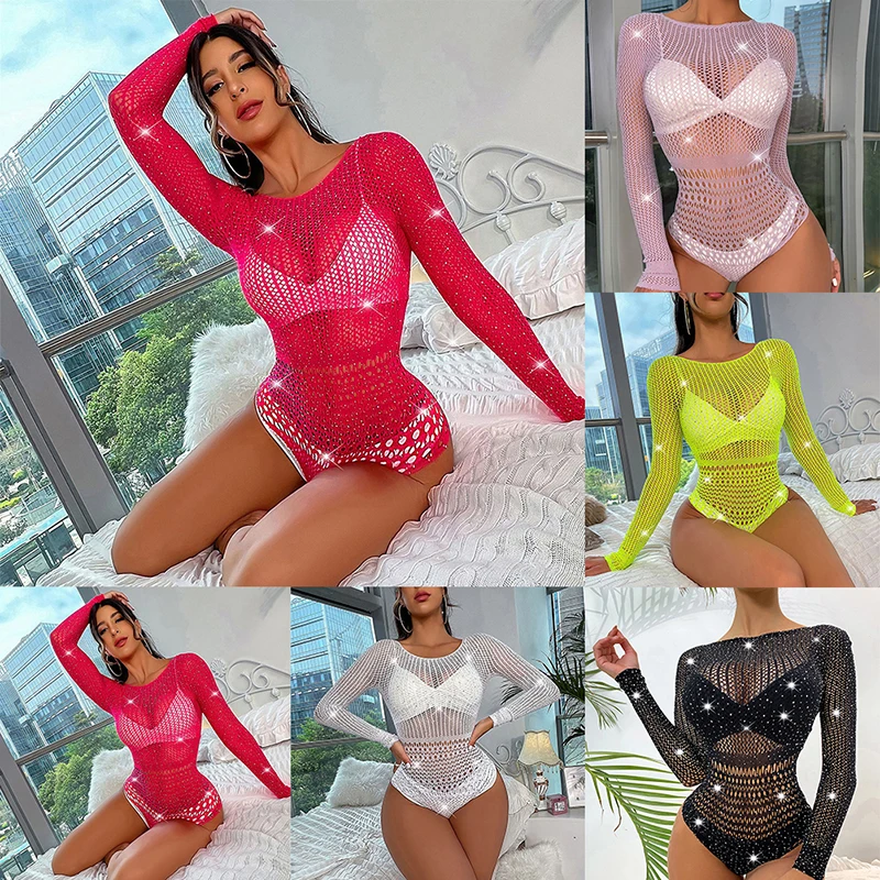 Sexy Women Bodysuit Rhinestone Backless Fishnet Jumpsuit Woman Body Suits Syllable Club Wear Rave Outfit Festival Clothing